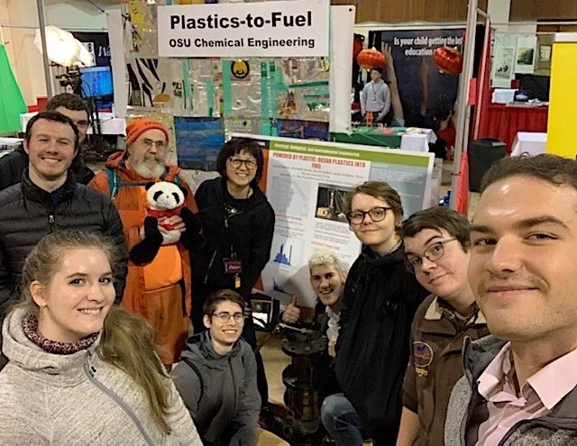Under the guidance of Dr. Skip Rochefort, the research team at Oregon State University (OSU) continued their plastics-to-fuel research in 2020 and presented their results to date at the OSU Virtual Engineering Expo in June of this year. The team discussed the progress made on designing a pyrolysis reactor for single-step conversion of waste plastics to diesel fuel. For those of you who are unfamiliar with this technology, pyrolysis uses heat in the absence of oxygen to thermally break down plastics into smaller hydrocarbons, such as those found in diesel fuel. Current research is focused on identifying catalysts to improve the quality and yield of the fuel product and on designing their next generation pyrolysis reactor – a small scale system that could be deployed in remote communities throughout the world.