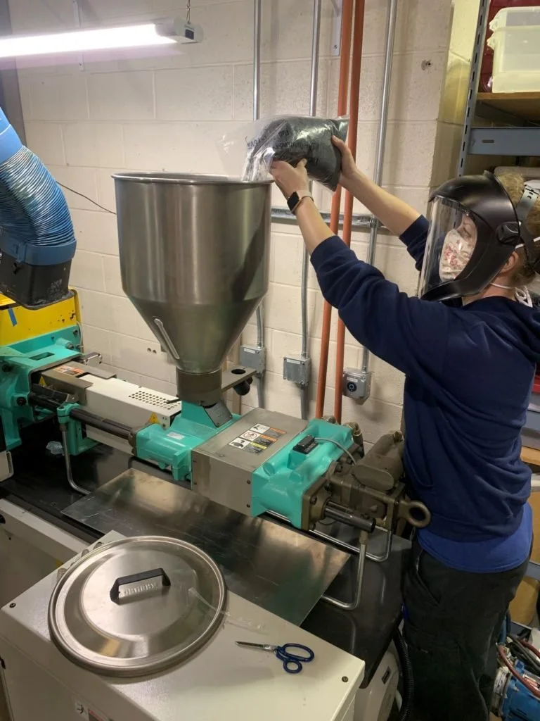 Western Washington student Juliana Covarrubias prepping for injection molding of test specimens made from recycled polypropylene/polyethylene from mechanically recycled nets and lines. WWU photo.