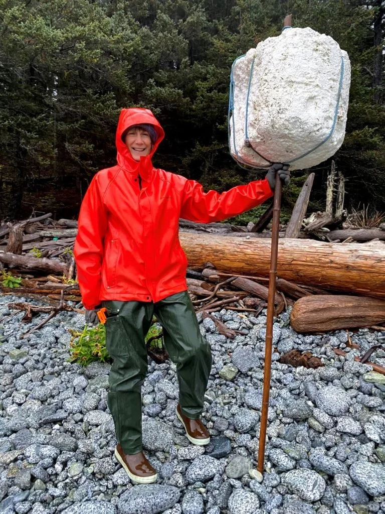 Volunteer Mary Forbes poses with a piece of ocean-recovered polystyrene on Afognak Island during the September removal expedition. ITN photo.